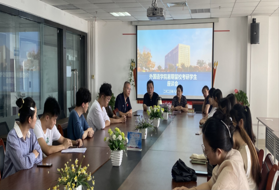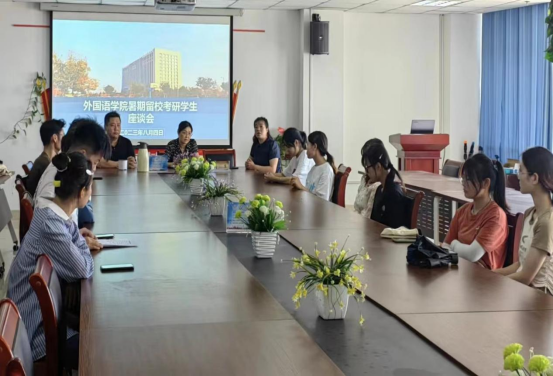 2023年8月4日上午,外国语学院召开暑期留校考研学生座谈会,学院书记冯宜丽,院长普昆,副书记靳静波,副院长王旭东,班主任王颜出席座谈会。