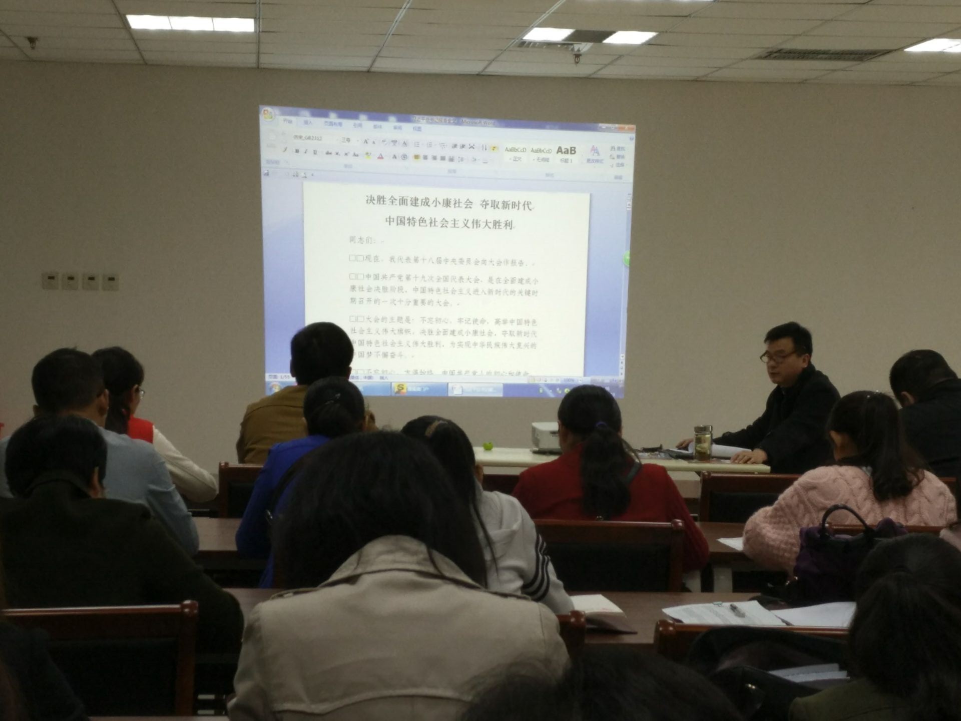 10月19日下午,我系党总支书记张红兵带领大家集中学习和解读习近平总书记在党的十九大会议上的报告精神。