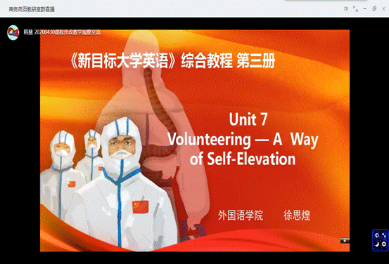 支部共11位教师参加选拔,大家以“抗疫中国”为主题,深入挖掘教材中的德育点,将中国可歌可泣的战疫故事、战疫英雄融入课堂教学,充分体现中国在战疫中的大国担当和迎难而上的英勇气概。张丽静老师以“Homesickness”为主题,将中国传统诗歌与本次战疫结合,家是最小国,国是千万家,守护国家是全民居家抗疫的共同结果。各美其美,美人之美,美美与共,天下大同。中国的大国情怀和勇气担当又为地球命运共同体贡献了自己的力量。徐思煌老师以“Volunteering—A Way of Self-Evelation”,以真实战疫中的志愿者故事为主线,将并非天赋异禀却奉献自己的可爱的人们鲜明地呈现于我们眼前,正是这些志愿者的所作所为,让我们感受到了人间的至善至美。袁瑞姣老师以“Genesis”为主题,面对疫情,中西方有着不同的处理疫情的方法,将西方的以自我为中心和中国的合作奉献精神的创世文化进行对比,一方有难,八方支援,唯有加强团结合作,才能尽快战胜疫情。韩慧老师将外宣翻译和疫情结合,详细讲解了中国援外抗疫物资上的寄语与英文翻译,向我们展现了等效翻译的艺术之美。以“中西医”为切入主题,贺红艳老师组织学生将中西医进行对比,并结合本次疫情中中医发挥的不可替代的作用,借此弘扬了中医的博大精深。