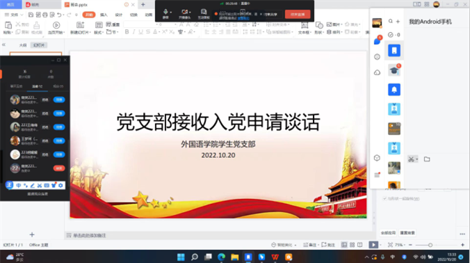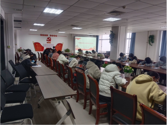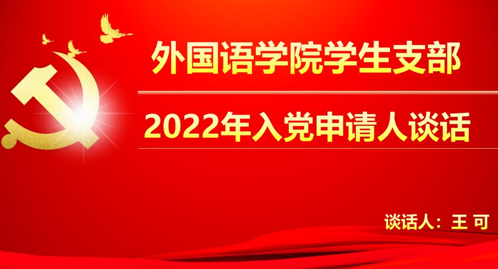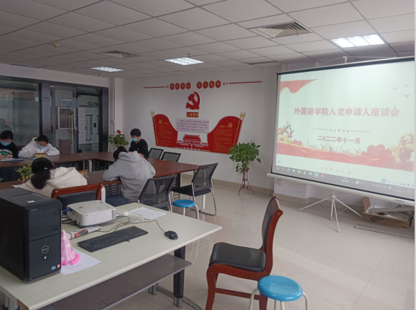 近日,外国语学院学生党支部分批次开展主题为“学习贯彻党的二十大精神”的入党申请人座谈会。新学期,外国语学院共有103名学生向党组织递交了入党申请书。本次集体谈话由学生支部书记李佩珊、组织委员王可、宣传委员于飙分组开展。