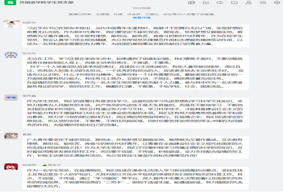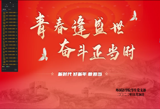 为进一步教育引导支部党员深入学习党的二十大精神,发挥党支部的战斗堡垒作用和党员的先锋模范作用,外国语学院学生党支部于20221126日以线上形式开展了“新时代 好青年 敢担当”主题党日活动。