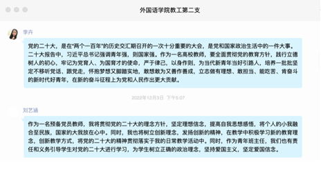 在本次活动中,支部教工党员结合工作实际,纷纷在“外国语学院教工第二党支部QQ群”中发表自己的学习感悟。