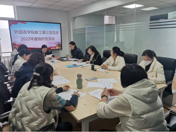 2023年2月23日下午,外国语学院教工第三党支部在创新楼1008召开组织生活会暨民主评议党员会议。大会由支部书记韩慧主持,学院党委书记冯宜丽以普通党员身份参加,支部全体党员参与。