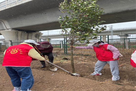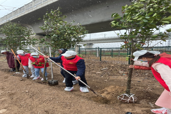 316日,我支部全体人员在新东农场义务植树。尽管三月桃花雪带来满满寒意,但党员们不畏寒冷、干劲十足,挖坑扶苗、挥锄培土、踩实修整、围堰浇水,整个过程环环相扣,配合默契,现场一片享受劳动快乐的欢声笑语。经过两个小时的辛勤劳动,一棵棵树苗安营扎寨,昂然挺立。