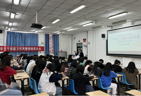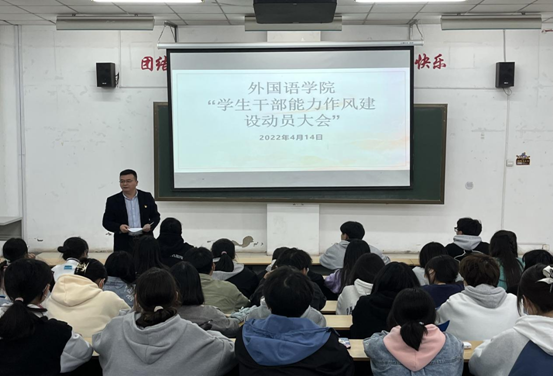 为推进共青团“学党史、强信念、跟党走”学习教育工作,进一步深化学生会改革成果,进一步增强学生干部队伍的凝聚力和使命感、加强学生干部的能力作风建设,4月14日下午,外国语学院召开了学生干部能力作风建设动员大会。大会由外国语学院党总支书记张红兵主持,全体学生干部参加了此次动员大会。