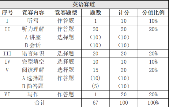 其中,英语赛道按照英语专业四级考试的试卷结构出题,初赛、决赛答题时间均为130分钟;比赛成绩满分均为100分。初赛、决赛答题时间均为155分钟;比赛成绩满分均为180 分。试卷内容如下: