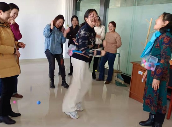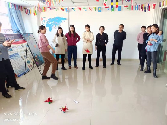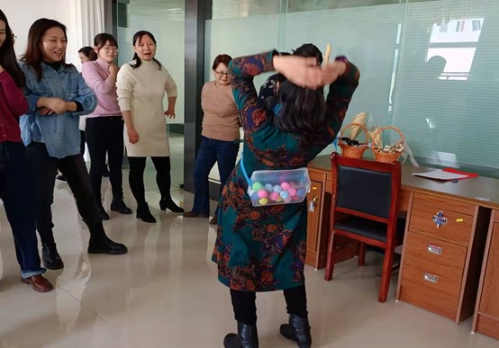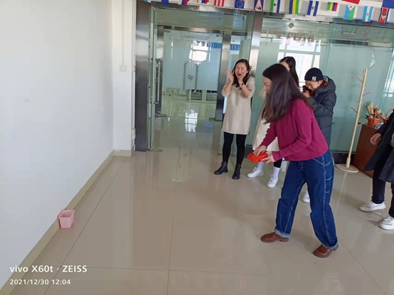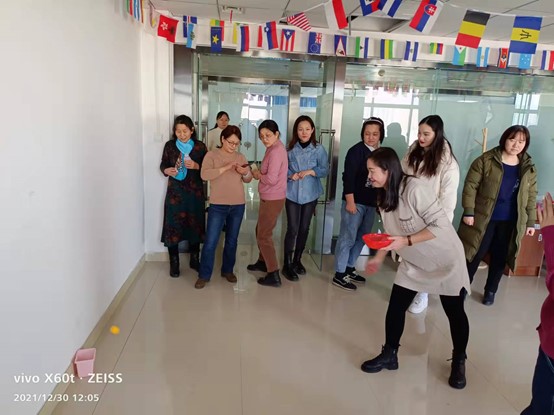 为了丰富我院教职工的业余生活,加强教职工思想感情交流,经院工会精心策划,2021年12月30日上午11:00,“外国语学院元旦迎新春”教职工游园活动在创新楼1002室如期举行。我系全体教职工积极踊跃地参加了本次游园活动。本次活动是集体项目,共有三个游戏,分别是“踢毽子”、“投球”和“乒乓球摇摇摇”,三个教研室分别派出代表,进行三项比赛,累计得分高的代表队胜出。在活动中大家积极参与,通力合作,努力拼搏,取得了不菲的成绩。带着这份喜悦与收获,全体教职工在喜庆、热闹的气氛中度过了愉快的时光。