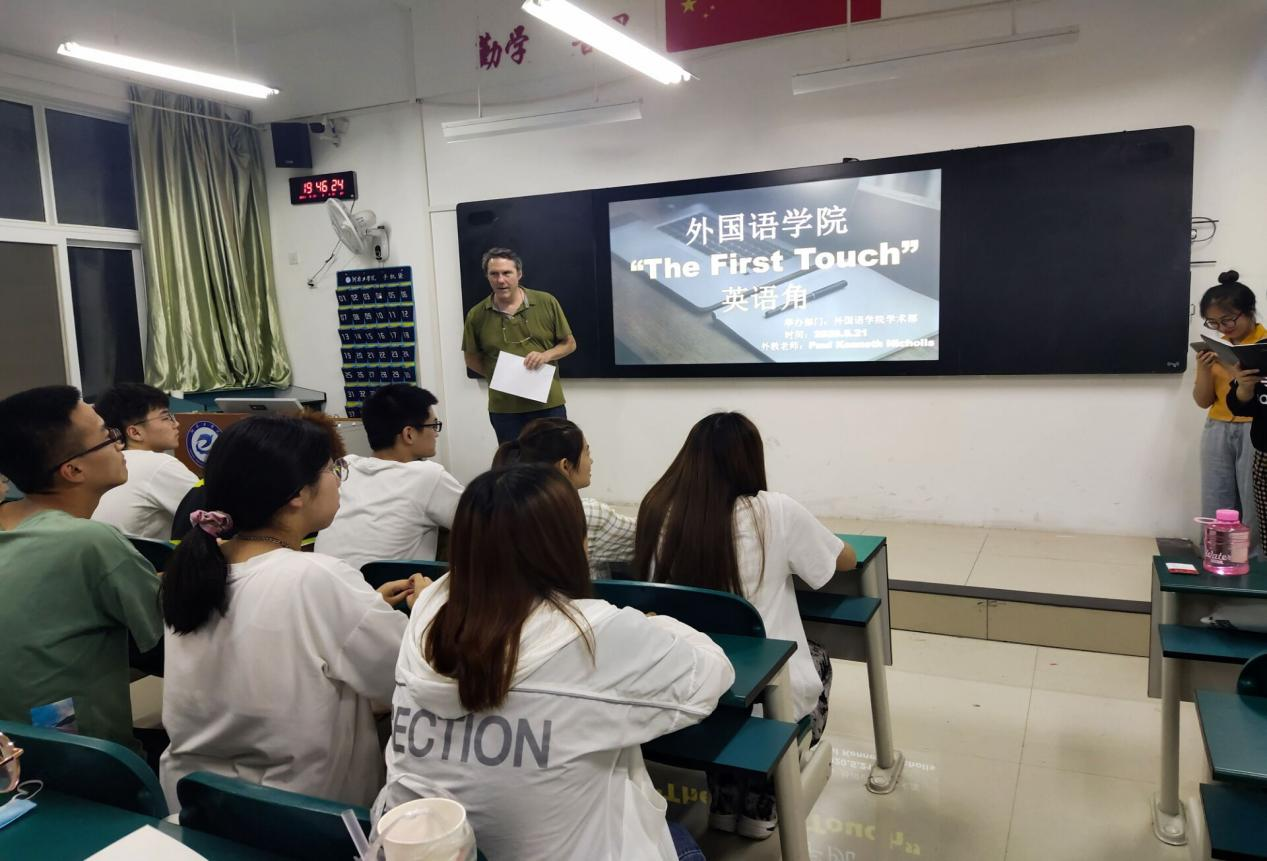 为进一步激发我院学生英语学习的热情,增强英语口语表达及应用能力,我院于2021年5月21日在教七楼352举办本学期第一期英语角活动。本次活动邀请外教Paul Kenneth Nicholls作为活动嘉宾,紧扣“The First Touch”主题,为同学们提供了一个课外练习口语的机会。