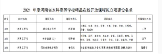 近日,河南省教育厅公布了2021年度河南省本科高等学校精品在线开放课程拟立项建设名单,我校申报的《数字电子技术》《大学英语(3)》和《带你走近电子商务》3门课程获批立项建设。