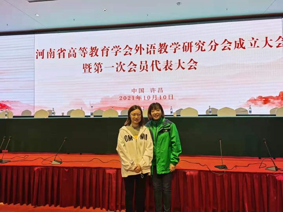 20211010日,由河南省高等教育学会主办,许昌学院承办,上海外语教育出版社、外语教学与研究出版社等共同协办的河南省高等教育学会外语教学研究分会成立大会暨中原外语名师大讲堂学术论坛在许昌中原国际酒店举行。我院大学英语第一教研室主任靳静波、商务英语教研室主任韩慧参加会议。