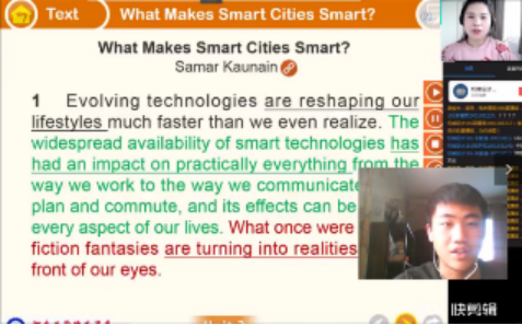 线上课堂实施:为了增加感染力,李燕老师会面带微笑,抑扬顿挫的进行讲解。为了激发起学生学习的动力和爱国热情,课前时政新闻中设置了中国速度”“逆行者等话题。正式课程开始,首先进行主题导入,关键知识点主要采用了直接扼要的讲授法,让学生最高效率的掌握重点内容; 通过练习法对重难点进行操练:使用随机连麦提问、互动面板,进行口述和翻译任务;通过活动帮助学生对所学内容深刻理解:使用视频连麦展示学生的课堂演说活动