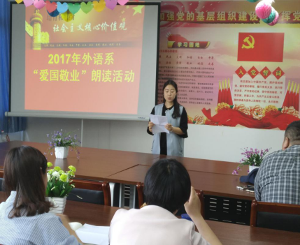 为弘扬民族精神、坚定理想信念、增强教师的社会责任感和历史使命感,抒发教师对工作的满腔热情,彰显教师爱岗敬业、奋发拼搏的风采,外语系党支部于4月21日下行3点在实字三号楼506,以“爱国、敬业”为主题,举办了“爱国奉献,彰显师风”朗读活动。