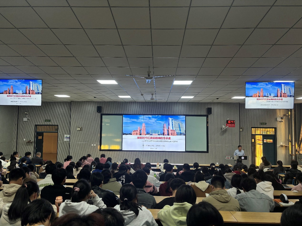 路阳以“做新时代红旗渠精神的传承者---学习习近平视察河南安阳红旗渠时重要讲话精神”为题,从红旗渠的修建过程及历史地位、红旗渠精神的内涵及渊源、红旗渠精神的时代价值三个方面展开了详细讲解。他强调,红旗渠的十年修建历程艰辛,谱写了新中国水利建设史上的壮丽诗篇,树立了伟大的精神丰碑——“自力更生、艰苦创业、团结协作、无私奉献”的红旗渠精神。课中,路阳向师生展示了一张张修渠过程的真实图片,讲述了杨贵、吴祖太、任羊成等感人肺腑的鲜活事例。他指出,红旗渠精神历久弥新,在新时代我们要坚持人民至上、坚定理想信念、勇于担当作为、坚持艰苦奋斗、凝聚精神力量,为中华民族伟大复兴作出应有贡献。