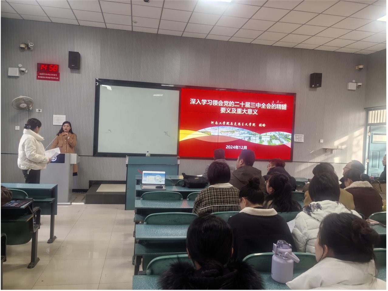 为深入学习贯彻党的二十届三中全会精神,按照外国语学院党委安排,12月5日下午,院党委特邀马克思主义学院张晗老师在教1楼A102室开展了关于“党的二十届三中全会精神”专题宣讲。讲座由院党委书记冯宜丽主持,外国语学院全体教师及部分学生代表参加了本次讲座。