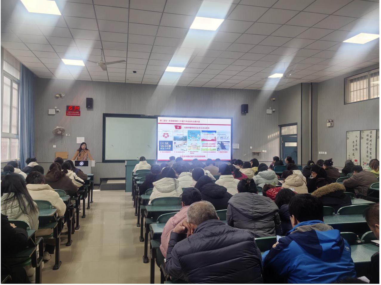 张老师以“继往开来鼎新篇,又踏层峰开新篇”为题开展讲座,张老师首先解释了题目中“新”字的含义,接着简要介绍了党的二十届三中全会的基本情况。为了更好地理解党的二十届三中全会的内容和精神,张老师以会议召开的“三个面对”背景为引入,介绍了党的二十届三中全会所要回答的主要命题以及中国共产党的中心任务。