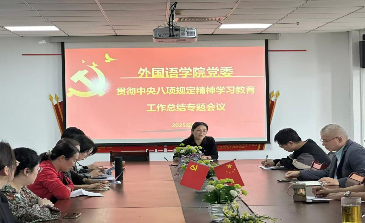 2025年9月18日,外国语学院党委在创新楼1012室召开深入贯彻中央八项规定精神学习教育总结大会,全体教工党员及部分学生党员参加会议。