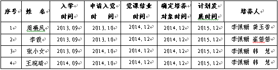 为加强对学生党员发展工作的民主监督,保证发展新党员的质量,现将发展对象周碾凤、李霞、张小女、王琬琦等4名同志的有关情况公示如下,以广泛听取意见。