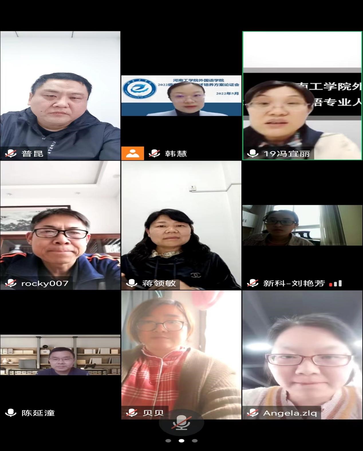为持续深化教育教学改革,进一步优化商务英语本科专业人才培养方案,提高人才培养质量,根据“关于制定2022版本科专业人才培养方案的指导意见”和“河南工学院本科教学基本建设6+3质量提升实施方案”等文件要求,5月9日外国语学院在创新楼1007会议室召开了2022级商务英语本科专业人才培养方案线上论证会。此次论证会邀请了河南科技学院外国语学院院长李会民教授、河南牧业经济学院外国语学院院长陈延潼教授、平顶山学院外国语学院院长蒋领敏教授、新乡市和协集团外贸部经理翟俊生、新乡市利菲尔特滤器股份有限公司国际贸易部总监李娜、新乡市新科防护科技有限公司人力资源部经理刘艳芳等六位校外专家进行指导。外国语学院院长普昆、副院长冯宜丽、商务英语教研室主任韩慧及商务英语教研室部分教师参加了论证会。会议由外国语学院副院长冯宜丽主持。