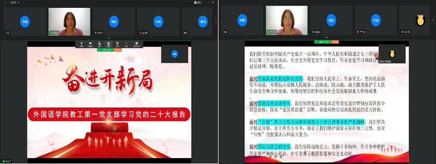 经过认真研习,我支部于10月28日通过钉钉会议开展线上“党的二十大精神之我见”主题党日活动。本次活动由支部支委的三位同志进行分享。支部负责人柴玉洁老师带领大家学习二十大报告中“过去五年的工作和新时代十年的伟大变革”这一主题的内容,她强调了报告中的新观点、新诊断、新思想。并且指出要真正做到学懂弄通党的二十大精神,将之贯彻融入到教学工作中,把大会精神转化为最鲜活的思政教育教学资源,深入落实立德树人根本任务。支部委员崔华娴老师带领大家学习了“新时代新征程中国共产党的使命任务”,她在展示中通过引用外国人眼中的中国现代化,使大家更能辩证全面地理解党的二十大报告精神;支部委员申磊老师带领大家学习了二十大报告中关于教育的论述,对“教育、科技、人才”等关键词进行了解读。