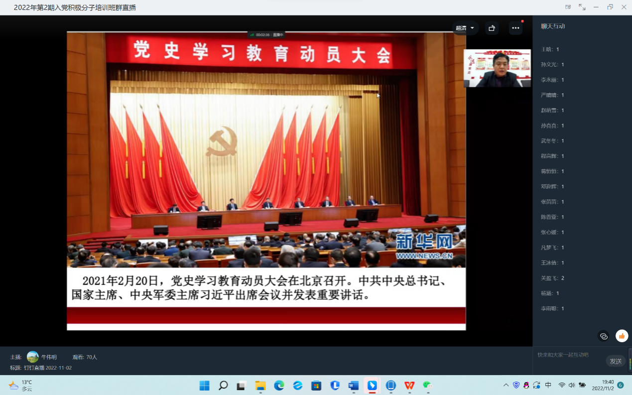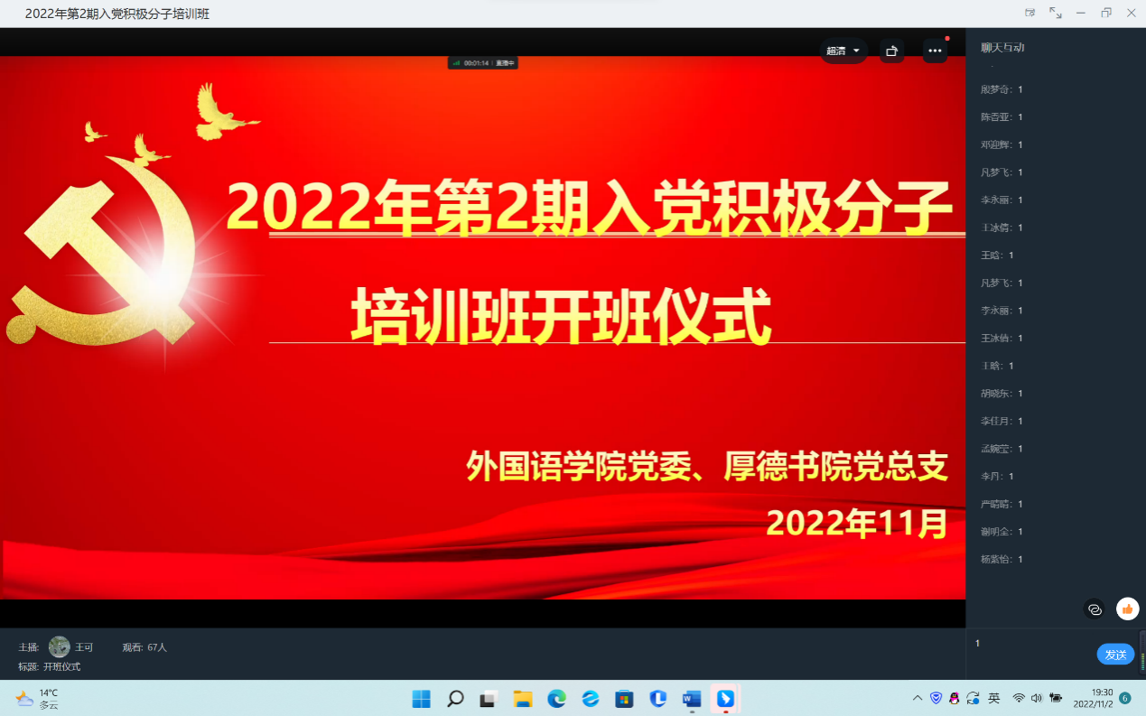 为进一步提高入党积极分子的政治素养,加强入党积极分子对党的性质、纲领和指导思想的认识,外国语学院与厚德书院合办的2022年第2期入党积极分子开班仪式于112日晚730分在线上如期开展。