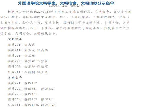 为进一步营造健康文明的校园生活,扎实推进校园文明建设,引导广大学生加强文明素养,培养学生良好的生活和学习习惯,近日,外国语学院组织开展了“文明班级、文明宿舍、文明学生”评选活动。本次评选活动分为前期组织动员、后期评审两个阶段,学院根据名额分配和条件要求,结合同学们提交材料情况和平时综合表现,经评议小组讨论,评选出外国语学院文明班级、文明宿舍和文明学生名单如下: