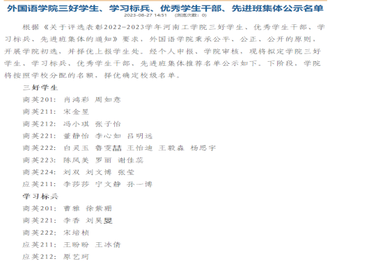 根据《河南工学院学生先进个人、先进集体评选办法》,外国语学院于近日开展2022-2023学年三好学生、优秀学生干部、学习标兵、先进班集体评选活动。