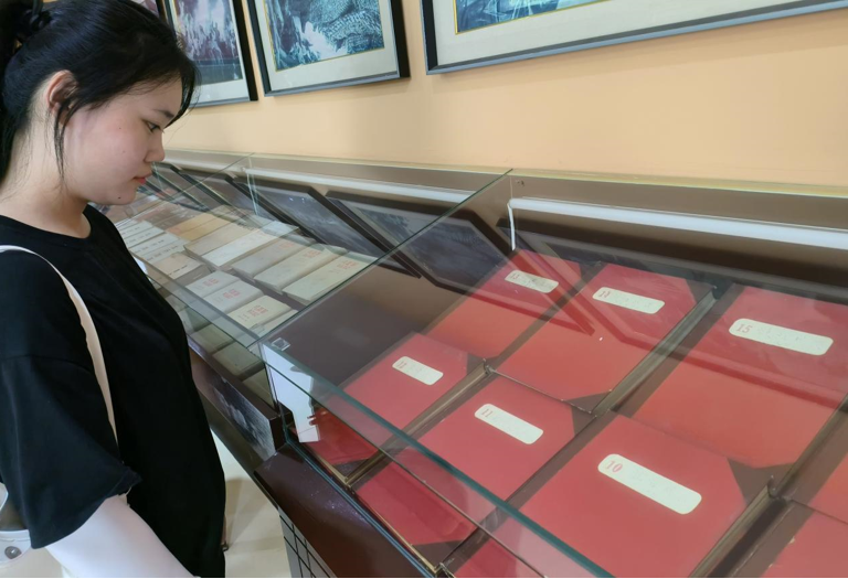 图为志愿者观看革命前辈介绍