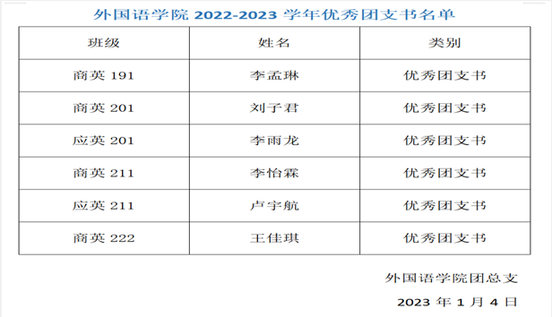 为充分发挥基层团支部在加强和改进大学生思想政治教育工作方面的生力军和突击队作用,全面激发基层团支部的工作积极性和主动性,充分发掘团支部书记的工作潜力,保持和增强共青团员先进性。落实班团一体化运行机制,激发团支部广大团干部和团员青年干事创业的热情,外国语学院于近期开展了2022学年“优秀团支书”评选工作。