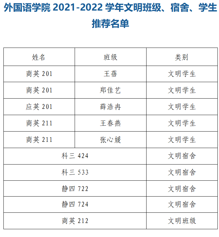 为开展好此次评选,我院坚持“公平、公正、公开”“科学、客观、真实”的原则,在评选前公布评选名额、评选条件,经学生/集体自主申报、学院评审公示,最终推荐王蓓等5人为文明学生,科三#533等4个宿舍为文明宿舍,商务英语212班为文明班级。
