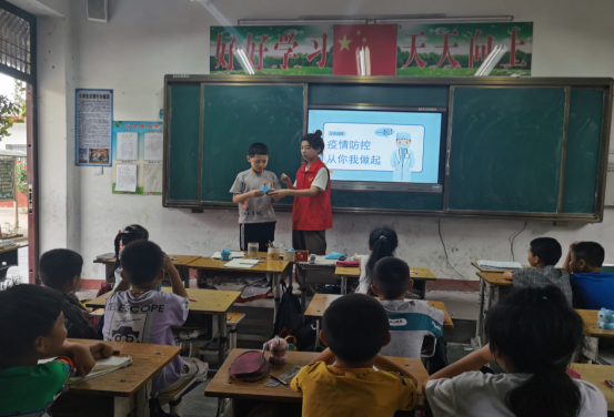 图为志愿者讲解疫情防控知识