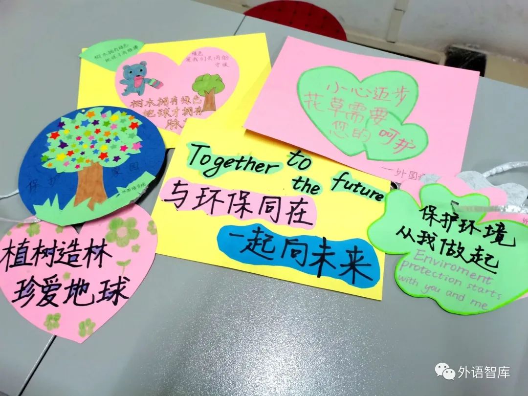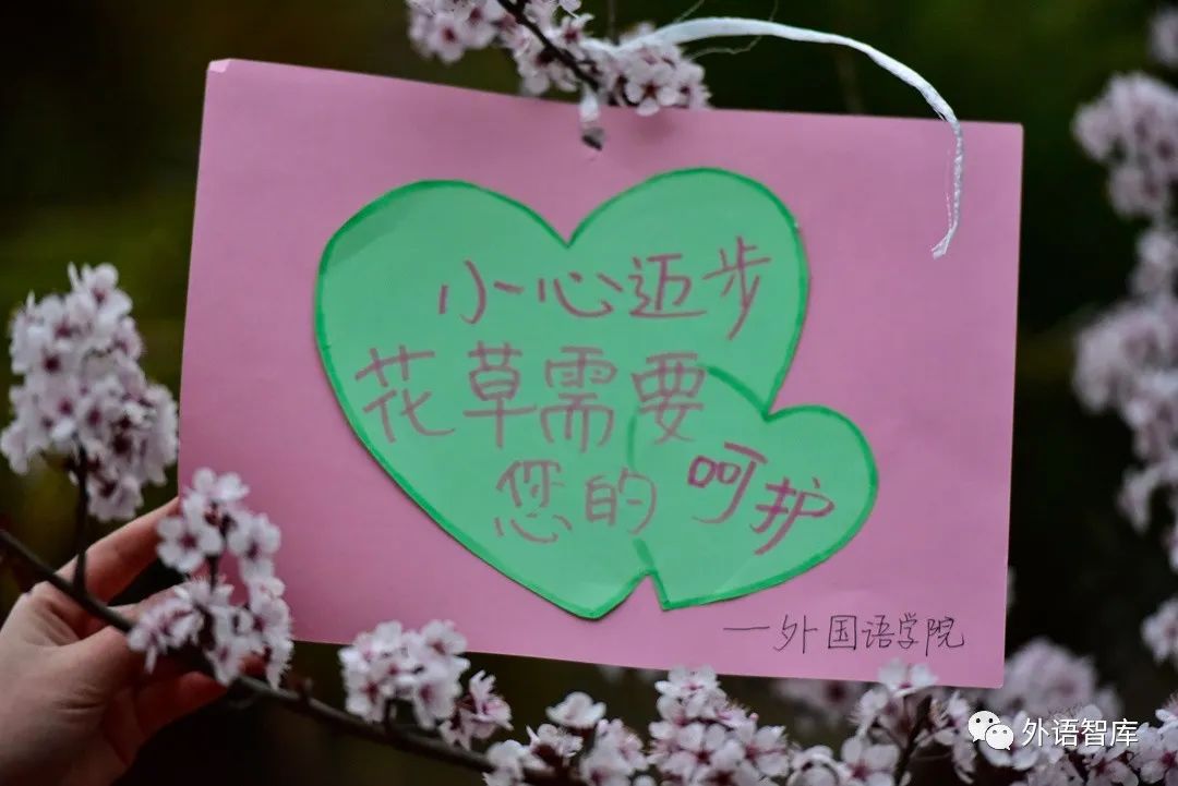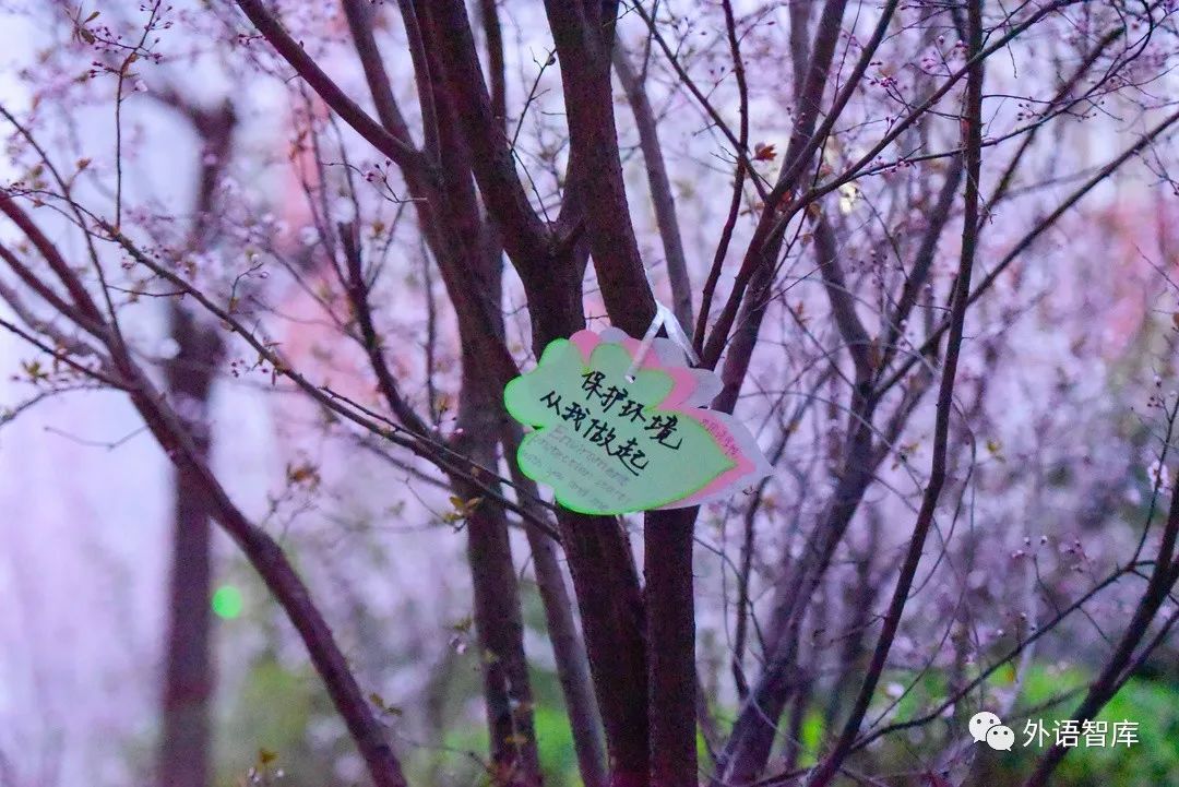 这次活动,大家一起动手制作标语牌,挂在学校的小树上,同学们步履匆匆去上课的路上,看到这和小花小树相应的标语牌,是不是也感受到了这不经意间的浪漫呢?