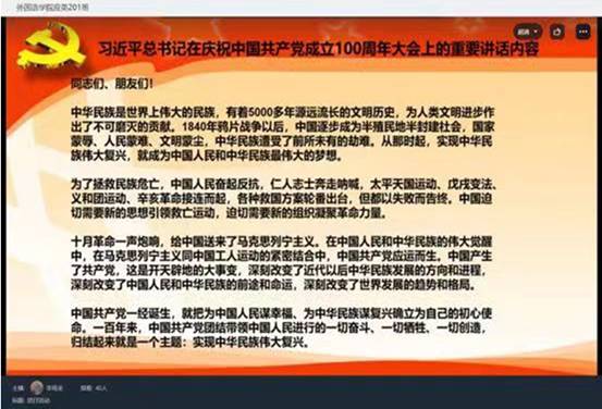 中国共产党因民而生、为民而兴。一百年来,中国共产党团结带领中国人民书写了中华民族几千年历史上最辉煌的史诗。为深入学习习近平总书记重要讲话精神,引导青年学子不忘跟党初心,牢记青春使命,我院于9月14日开展线上主题团日活动,会议由各班团支书发起并主持。