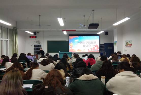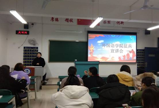2020年12月22日,外国语学院征兵宣讲会在工科组团424召开,本次会议由我院征兵联络员、辅导员张婷主持。