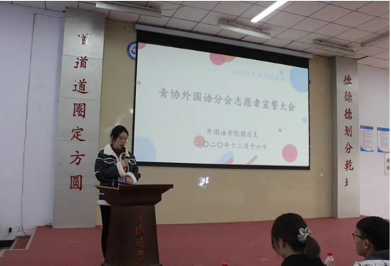 在大会上,外国语学院辅导员张婷老师、优秀志愿者代表为本次大会致辞。他们的发言让在场同学更深一步地了解到了志愿者的职责,并表达了志愿者们能够尽己所能,不计报酬地帮助他人,服务社会的精神希冀。随后青协外国语分会负责人卢剑带领大家通过视频回顾了我院活动开展历程,着重介绍了“情暖中秋,爱在河工”及“爱心汇聚,执笔绘梦”三下乡暑期实践活动,让同学们通过影音图像感受到志愿者活动的深刻意义。随后,我校国旗护卫队迈着铿锵有力的步伐护送我院青年志愿者服务队队旗上台。最后,20级学生代表王饮川带领同学们在外国语学院青年志愿者服务队队旗前庄严宣誓。