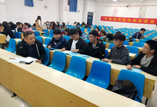 会议开始,于飙老师首先就外国语学院导师制的开展情况、发展历程做了简单介绍,并向同学们介绍了每位导师的基本情况和讲授课程。随后,每位导师与各自指导的学生进行了面对面的交流。在交流的过程中,导师们结合自己的经验解答了同学们在学习和生活等方面的疑惑,并就专业学习、第二课堂活动、就业实习、考研深造等方面的内容提出了各自中肯、客观的意见和建议。