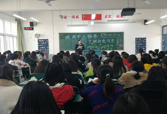 张老师首先介绍了我校的历史、现状、发展趋势和杰出校友等方面的内容,让同学们了解到,建校40多年来,学校弘扬“开拓进取,自强不息”的学校精神,秉承“产教融合、校企合作”的优良传统,经过几代人的艰苦创业和砥砺奋进,终于走出了一条具有自身特色的发展道路,形成了鲜明的办学特色。随后,张老师开展了道德与法制教育,引导学生认真贯彻《公民道德建设实施纲要》,教育同学们自觉遵守爱国守法、明礼诚信、团结友善、勤俭自强、敬业奉献的基本道德规范。