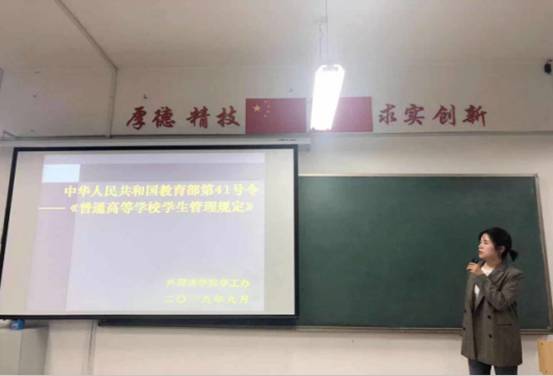 我院2019级辅导员张婷结合实际,为新生讲解了《大学生活指南》中的重点内容,涵盖国家教育法律法规、综合素质考评、考试纪律、课堂教学秩序管理、违纪处罚、奖助学金评定、宿舍管理及日常行为等方面,并就《普通高等学校学生管理规定》《高等学校学生行为准则》等内容作了重点阐述。