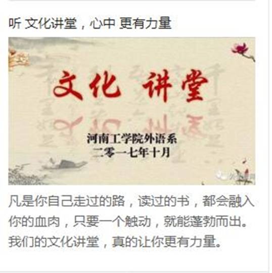 文化讲堂宣讲活动有效地引导了新时代大学生传承传统文化、弘扬时代精神、讲好中国故事的态度和理想,对营造文明健康、积极向上的时代风貌具有积极作用。(外语系学工办文/图)