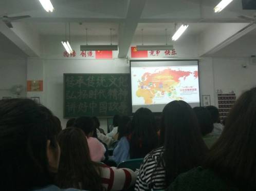 随后,同学们在观看《你好 一带一路》、国家形象宣传片——《中国进入新时代》、《社会主义核心价值观》等宣传片的过程中,深刻体会了十八大以来世情国情党情的巨大变化,并分组讨论了如何在“一带一路”倡议下,践行社会主义核心价值观、实现中国梦。