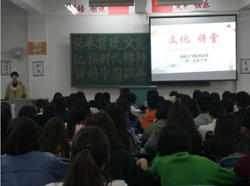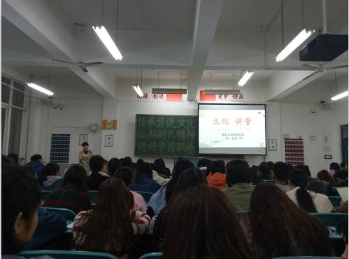 “一带一路”倡议促进了国与国之间的深入交流,互联网的飞速发展则让“坐地日行八万里,巡天遥看一千河”成为可能。在这种包容、交流、分享与共赢的大环境下,不同地域、不同信仰、不同民族所蕴含的思想传承、纷繁文明、苍茫历史、悠长足迹等都为高校的思想政治教育内容增添了新的内涵。为深入贯彻落实党的十九大精神,弘扬文化自信,积极培育和践行社会主义核心价值观,促进青年学生健康成长,根据学校要求,我系开展了文化讲堂——“弘扬社会主义核心价值观传承中华民族优秀传统文化”主题宣讲活动。本次活动由外语系辅导员李佩珊主讲,大一、大二全体学生参加了本次活动。