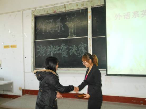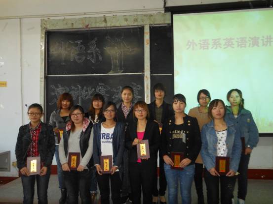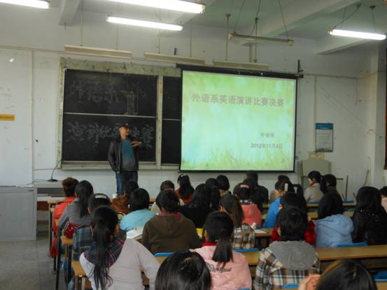 为了激发广大学生学习英语的热情,提高大家对英语口语的兴趣,营造一个良好的英语学习氛围,为更多的学生提供一个尽情挥洒创意、展现英语风采的舞台,外语系在得到团体老师和同学们的大力支持下举办了英语演讲比赛,决赛于2012年11月4日上午9:00在1#114举行,全体大一新生及大二学生参加了此次比赛。