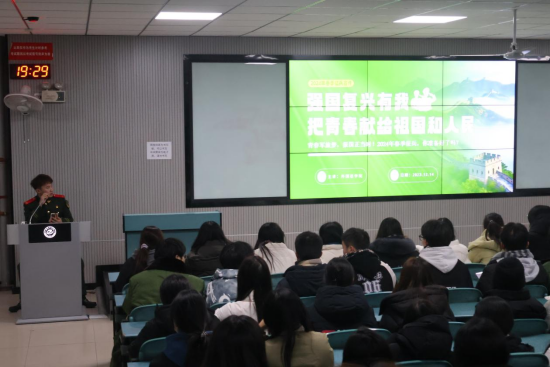 志存高远砺青春,参军报国立伟业。为进一步提升我院青年学子国防意识,激发大学生参军报国热情,扩大征兵宣传覆盖面和影响力,切实做好我院2024年春季征兵工作。12月14日晚,外国语学院在教学1号楼A204教室举办“强国有我,把青春献给祖国和人民”征兵宣讲会。