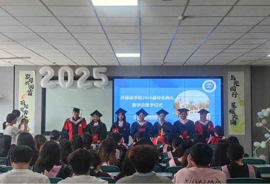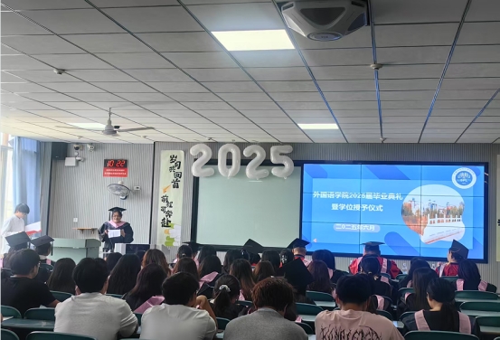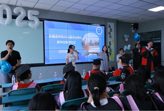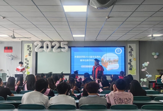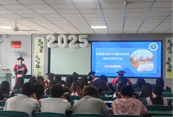 2025年6月13日上午10时,外国语学院2025届学生毕业典礼暨学位授予仪式在教1B201隆重举行。学院院长普昆、党委书记冯宜丽等领导班子成员、教师代表及毕业生代表、在校生代表齐聚一堂,共同见证这一庄重而温暖的时刻。