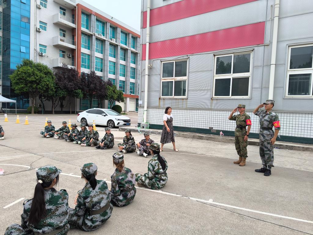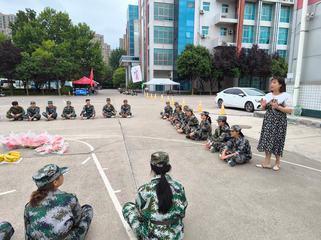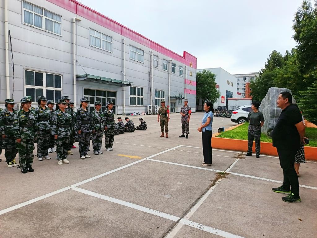在学校实训场地旁的军训区域,身着迷彩服的新生们或整齐列队、或有序围坐。学院领导首先与带训教官亲切交流,详细询问军训进度、科目安排及新生训练状态,对教官们的严谨带训、辛勤付出表示衷心感谢,并为教官送上了消暑慰问品。