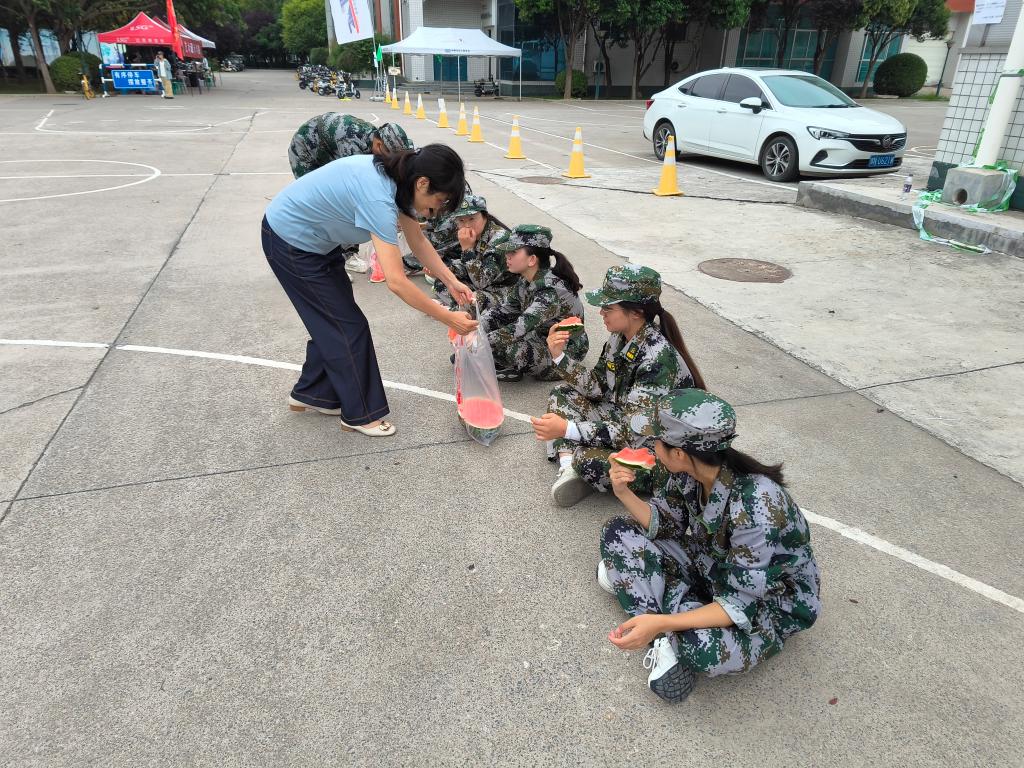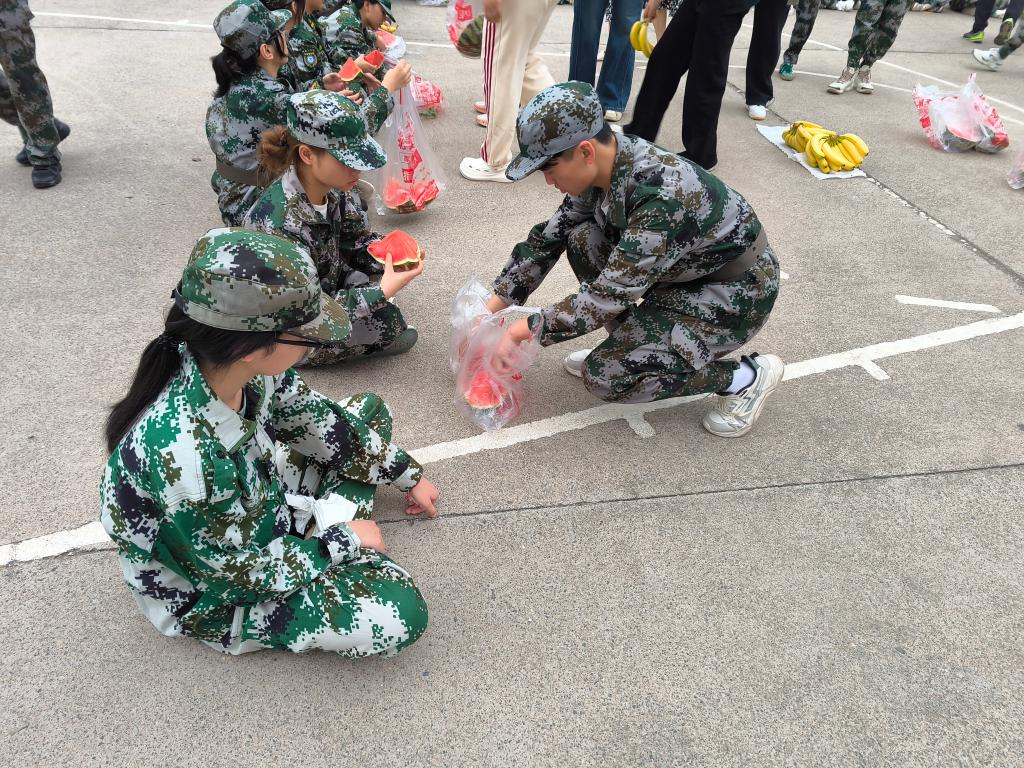 随后,领导班子走到新生中间,关切询问同学们的军训感受与身体状况,叮嘱大家在刻苦训练的同时注意防暑降温、劳逸结合,鼓励大家以饱满的精神面貌投入训练,在军训中锤炼意志、增强体魄,上好大学入学的“第一课”。领导们与学生骨干一同将切好的西瓜递到新生手中——清甜的果肉驱散了训练的疲惫,现场不时响起同学们的欢声笑语,氛围温馨而热烈。