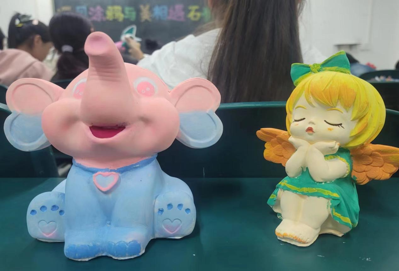 活动伊始,同学们执笔挥墨,用自己丰富的想象力和创造力绘染着自己的石膏娃娃。大家认真地调色、勾线、涂抹,无一不彰显着他们的热忱与青春活力。素白的石膏经色彩点缀而精妙绝伦,仿佛拥有了鲜活的生命:甜美可爱的小精灵栩栩如生,呆萌搞怪的史迪仔勾起童年回忆,憨态可掬的小飞象丰富多彩……这些作品充满了同学们的绮思遐想,他们用画笔和颜料表达了自己对美的理解和感受,也展示出自己的个性和独特之处。创作完成后,大家纷纷与朋友分享成果与喜悦,每个人都在镜头下与自己的作品拍照留念。活动现场充满了欢声笑语,氛围热烈又愉悦。