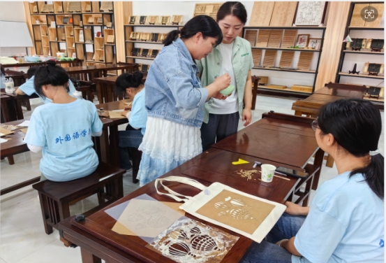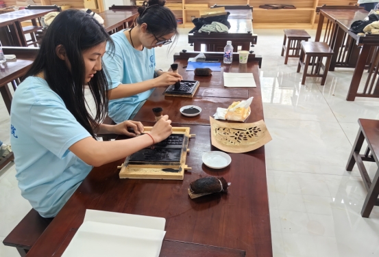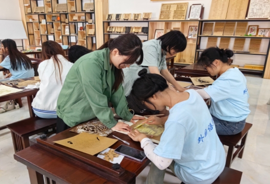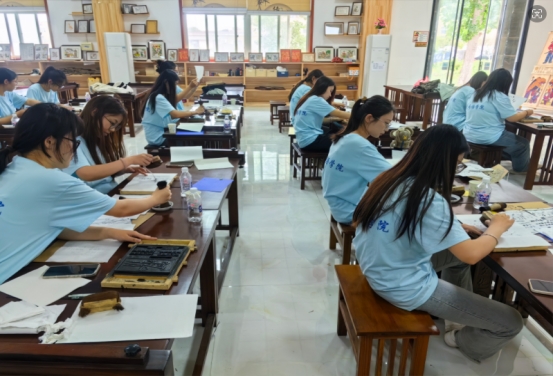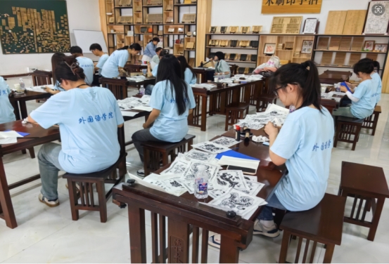 在上午的“字里行间”环节中,同学们积极投入到活字印刷、线装书制作、雕刻橡皮章版画以及年画绘制等丰富多样的活动中。通过这些实践,同学们既领略了传统文化的魅力,又锻炼了动手能力和创造力,实现了劳育与美育的有效融合。主讲老师详细讲解,同学们认真实践,助教老师从旁耐心指导,现场氛围热烈而有序。
