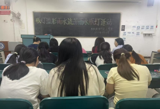 活动伊始,工作人员组织好现场的秩序,为大家提供了丰富多样的材料,从五彩斑斓的小灯,到形态各异的水瓶,激发着同学们的创作热情。同学们围坐在一起,相互交流着自己的创意构思,现场氛围热情高涨。进入实操环节,有的学生计划以“星空”为主题,用独特的小灯打造出璀璨的流星小瓶;有的同学则想把干花封存在瓶中,留住春日谷雨的芬芳;还有的学生将自己喜欢的英文诗句书写在彩纸上,仔细粘贴在瓶身,展现出独特的文化魅力和文艺气息。随着时间的推移,一个个独具匠心的雨水瓶灯成型。活动最后,同学们手捧着自己的作品,脸上洋溢着自豪与满足的笑容,相互展示、拍照留念,现场充满了欢声笑语。