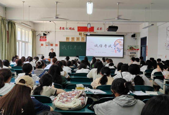 班会上,班主任向同学们强调树立正确的纪律观念和诚信意识。班会内容主要围绕诚信考试、考风考纪的严肃性和重要性、考试作弊违纪处分教育以及考试作弊的危害等,引导学生们以拼搏进取的精神开展复习,迎接考试。各位老师还着重指出,学生参加无论校级考试还是国家级考试,不论任何理由,试卷和试题册等考试相关材料是不能损坏的,发现故意损坏一律按考试违纪处理,并给予相应处分;并提醒学生党员和学生干部应做好模范带头作用,营造浓厚的班级学习复习考试的氛围,争做有为青年。此外,班主任重点了解各班学业困难学生的备考情况,并及时给予心理疏导和帮扶。每位学生都知晓并签署《诚信考试承诺书》。