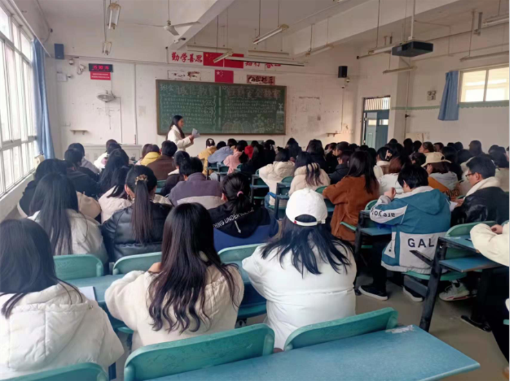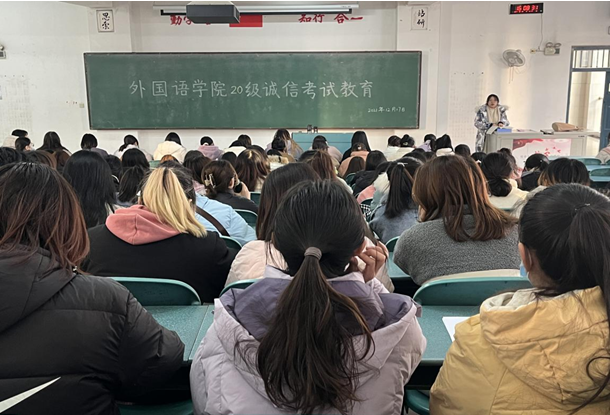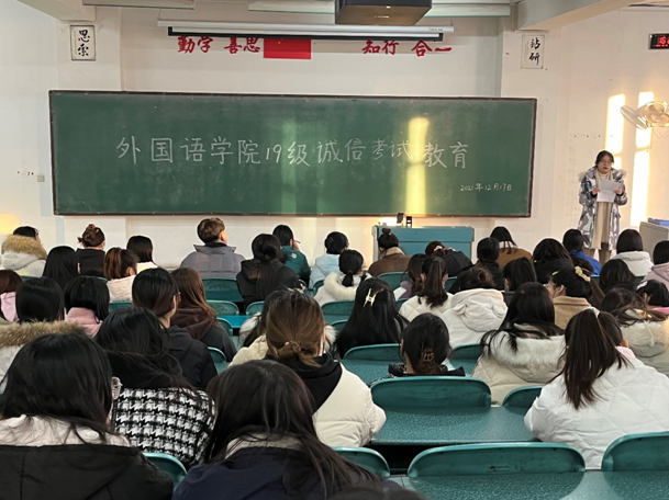 面对即将到来的全国大学英语四、六级考试,2022年全国硕士研究生招生考试,校内期末考试,为进一步推动考风考纪建设,加强学生考试诚信教育,培育和树立良好的考风,2021年12月17日下午3点50,外国语学院组织全体学生在教1#C208教室召开“诚信考试教育”主题大会。
